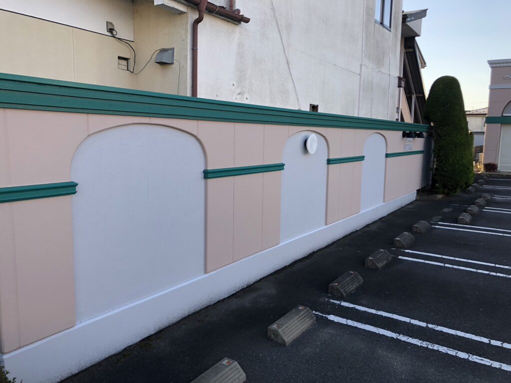 二本松市のI様邸の外壁、塀の塗り替えをさせていただきました。壁部の飾り、アクセントのグリーンがとても上品です。全体にフィーラーを施したので、上塗り塗料色がきれいに出ています。また何かございましたらいつでもご相談いただければと思います。ありがとうございました。